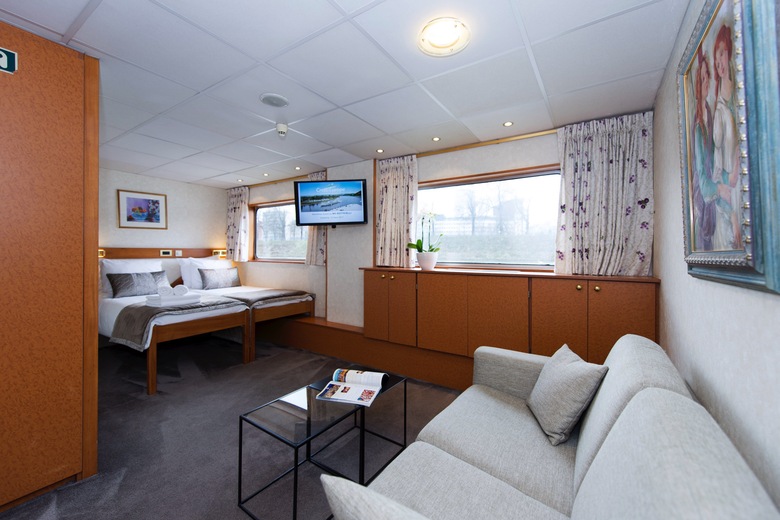 Spacious and comfortable cabin equipped with two beds that can be separated, private bathroom with shower and bath products, satellite TV, safe, hairdryer and radio. Located on the main deck with large window, it offers a panoramic view of the landscapes.AmenitiesTVTelephone (for internal calls only)Bathroom with shower and toiletTowelsSafeIndependent air-conditioningElectricity 220VWi-FiPlease note that there is no laundry service on board the ship.