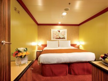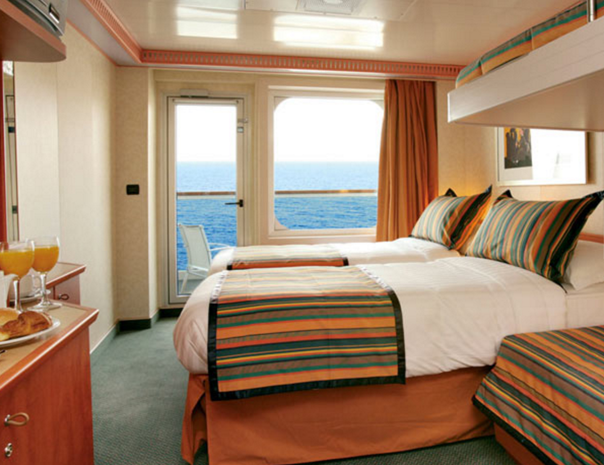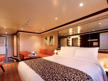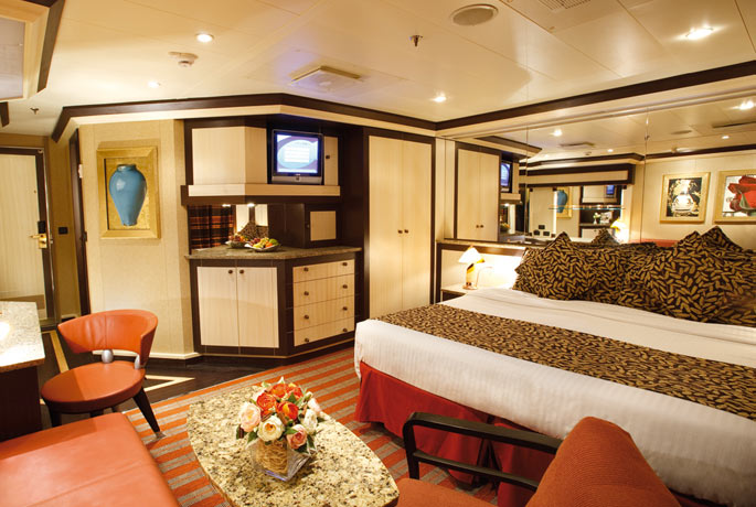 - Two twins that convert to queen-size - large panoramic windows with glass doors - private veranda - closet space - private bath with whirlpool tub and shower - expanded seating area - desk - sofa bed - vanity - television - phone - hairdryer - mini bar - safe Cabin size includes balcony
